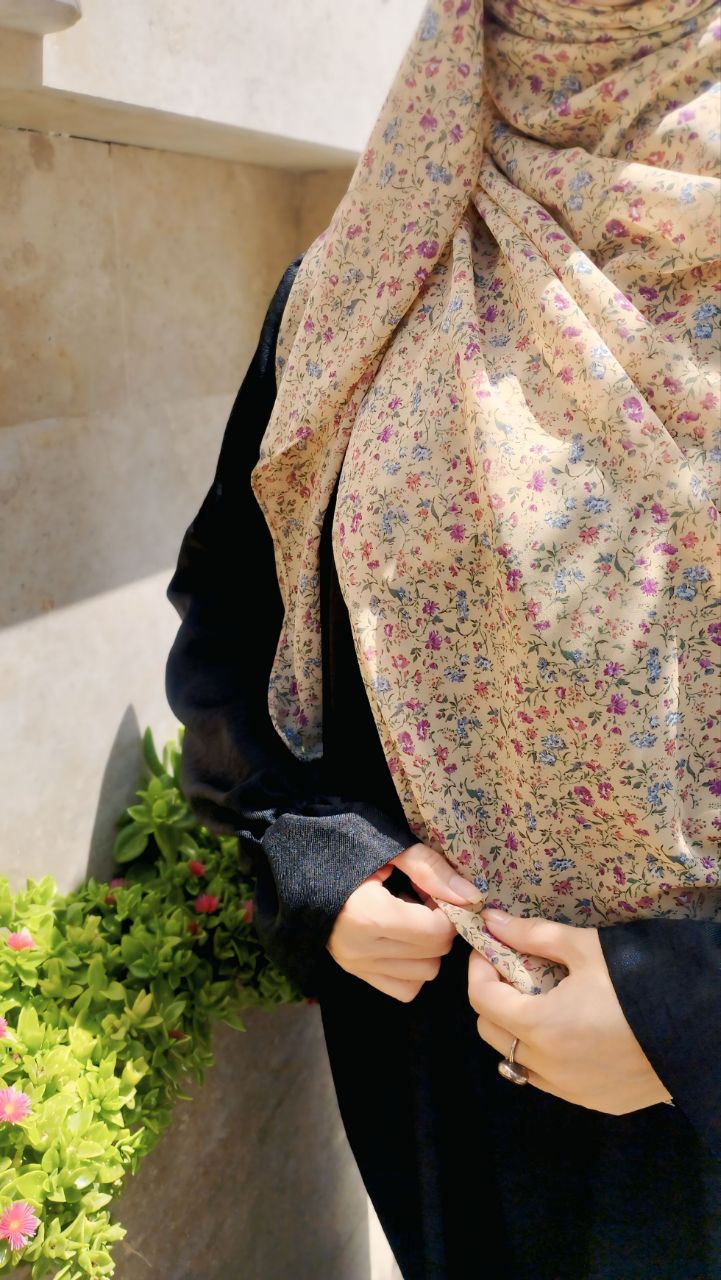 روسری حریر ژرژت نخودی (کرم زرد) گلدار