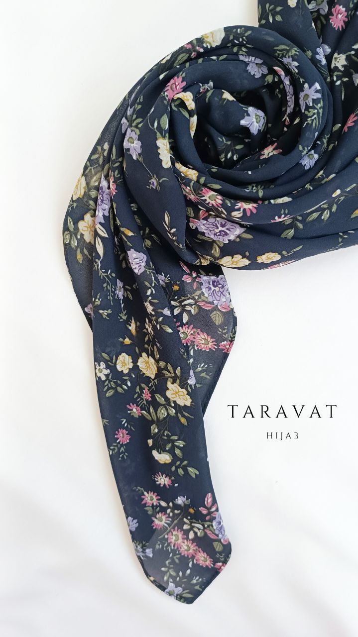روسری حریر ژرژت سرمه ای تیره گل ریز شکوفه ای