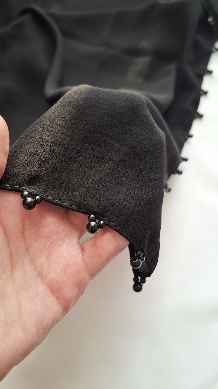 روسری کرپ حریر مشکی دور مروارید دوزی شده دو ضلع روسری مروارید دوزی شده و دو ضلع ساده هستش قواره حدودا ۱۳۰